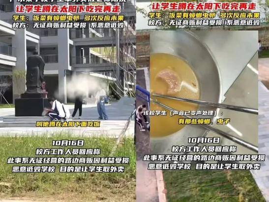 据网友发布的视频显示,遭到教师取保安的劝阻,部门学生被要求“蹲正在太阳下吃饭”。视频发布后,#学生取外卖遭劝阻#话题敏捷登上热搜,网友纷纷质疑校方办理体例能否过于。有学生暗里透露,校内食堂菜品单一、价钱偏高,以至曾呈现饭菜中有甲由虫卵的环境,多次向校方反映未果,这才选择点外卖。